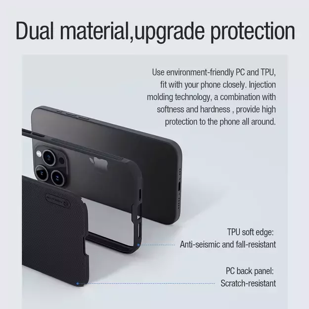 No matter how intensively you use your phone, the Nillkin Super Frosted Shield Pro case will provide it with full protection against damage in every situation. The use of two materials (flexible TPU and solid PC) ensures that each surface of your device has an appropriate level of protection. The corners act like an airbag: they absorb falls even from great heights.